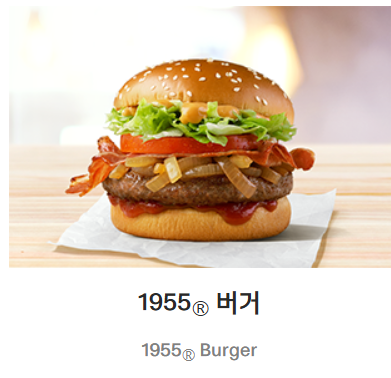 - 구성: 쇠고기 패티, 베이컨, 그릴드 어니언, 토마토, 케첩, 머스터드, 특제 1955 소스