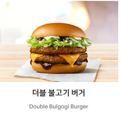 - 구성:쇠고기 패티 2장, 불고기 소스, 치즈, 양상추, 마요네즈